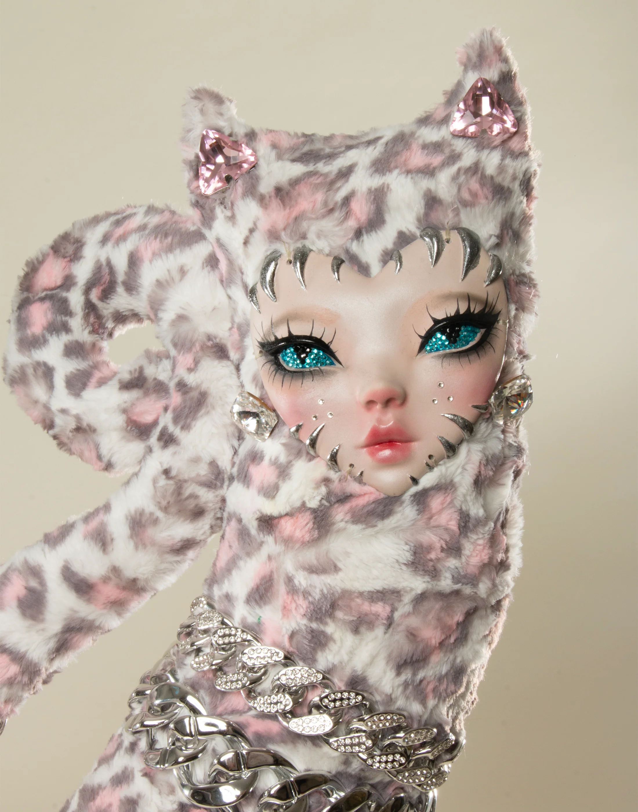 Original face sculpt: hand-cast resin; hand-painted with acrylic paint; crystal stoning. Plush body: hand-sewn faux-fur with lightweight faux-metal jewelry and rhinestone buttons; polyester fiber stuffing with polyester weighted beads at base.