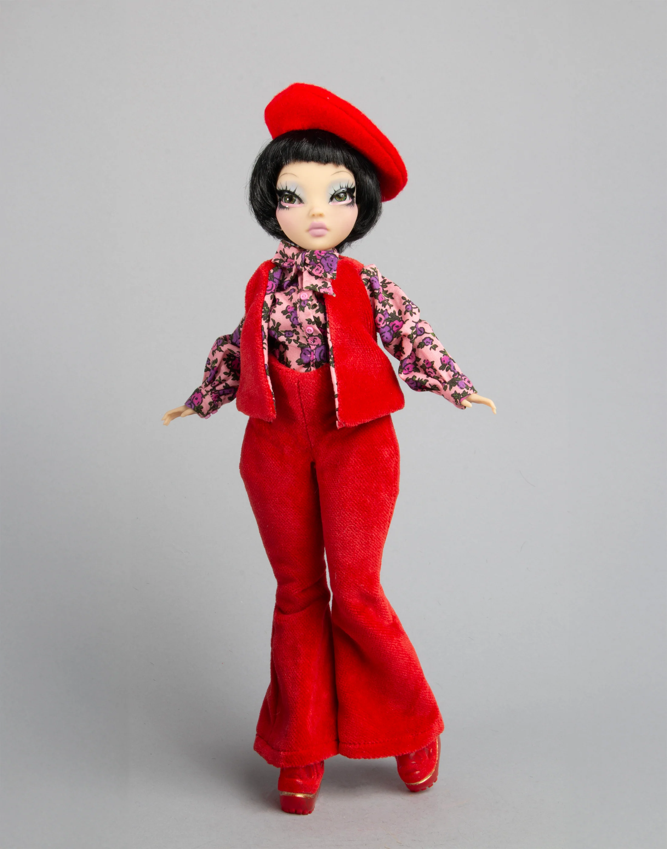 Red velvet bell-bottomed pants suit; red felt beret with pearl detail; pink cotton ditsy floral blouse with pussy bow, 3D-printed flex-resin shoes with acrylic paint and flocking.