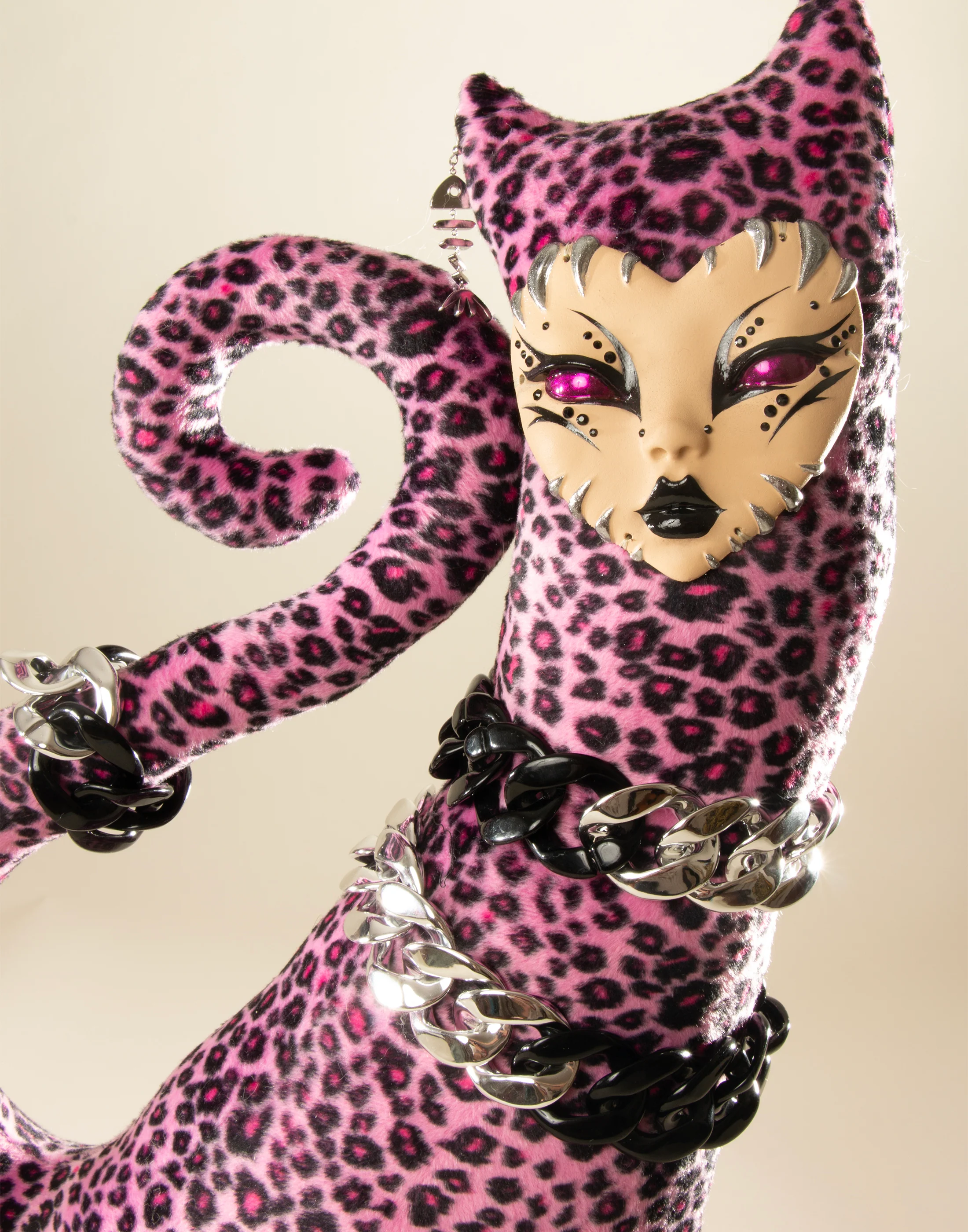 Original face sculpt: hand-cast resin; hand-painted with acrylic paint. Plush body: hand-sewn faux-fur with lightweight faux-metal jewelry; polyester fiber stuffing with polyester weighted beads at base.