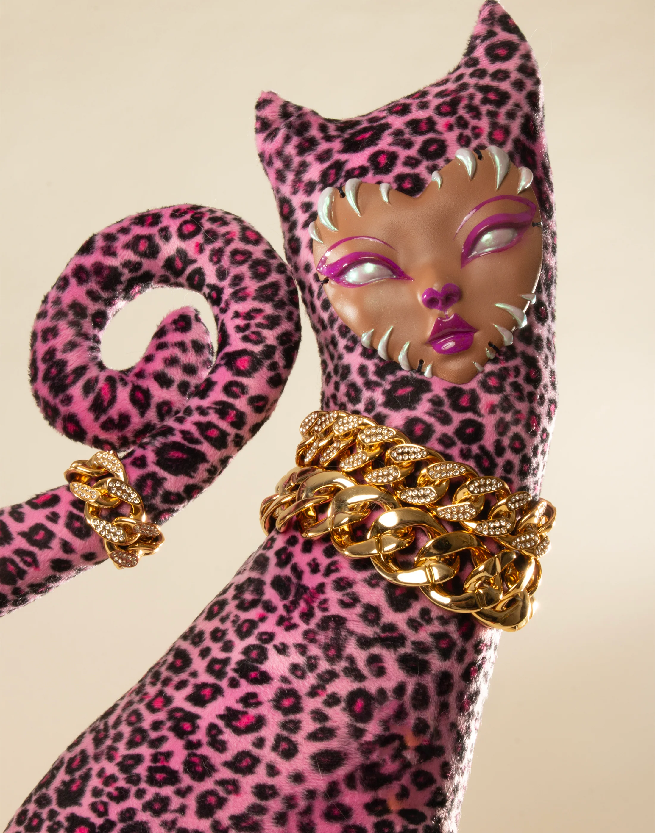 Original face sculpt: hand-cast resin; hand-painted with acrylic paint. Plush body: hand-sewn faux-fur with lightweight faux-metal jewelry and rhinestone button; polyester fiber stuffing with polyester weighted beads at base.