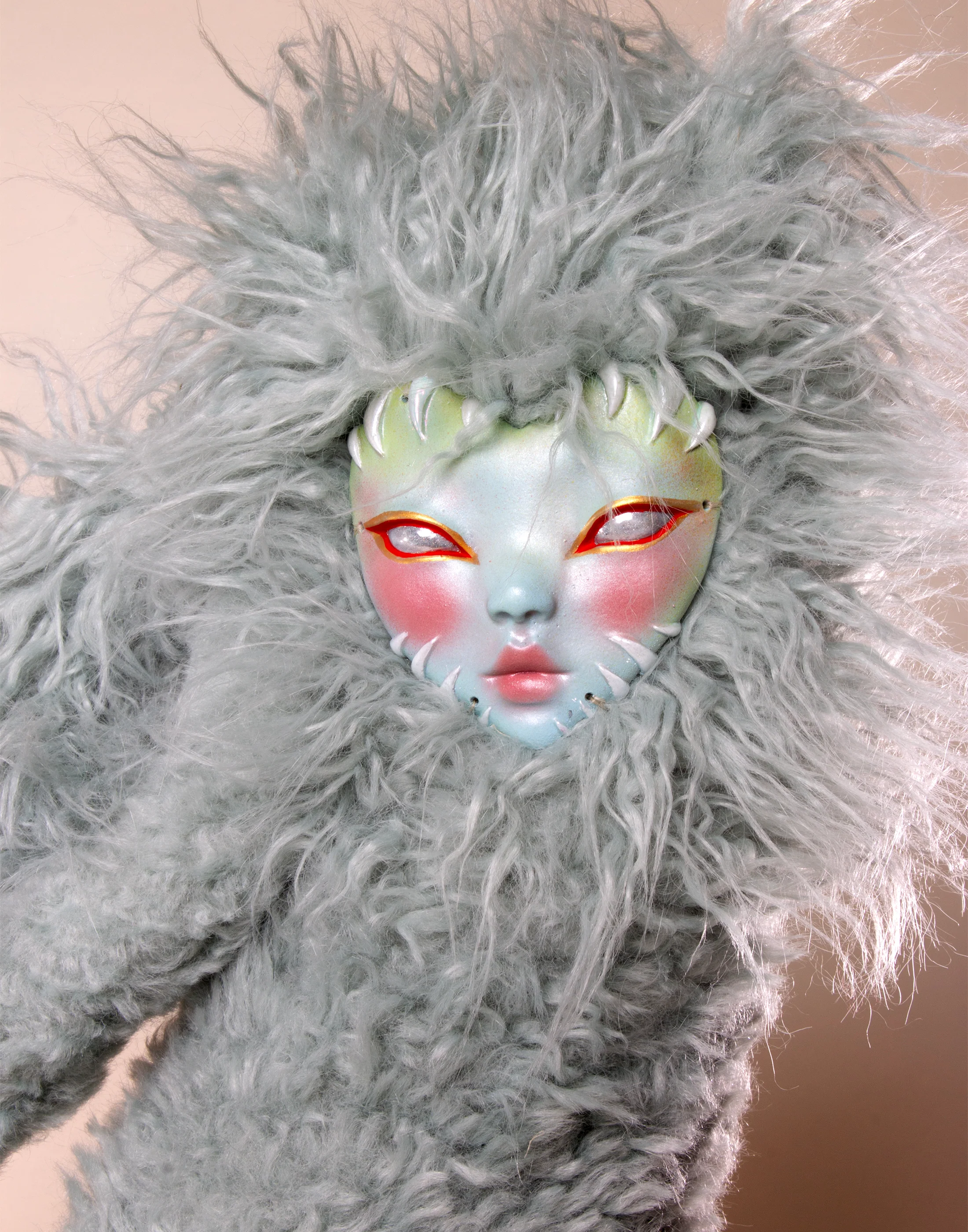 Original face sculpt: hand-cast resin, hand-painted with acrylic paint. Plush body: hand-sewn faux-fur, polyester fiber stuffing with polyester weighted beads at base.