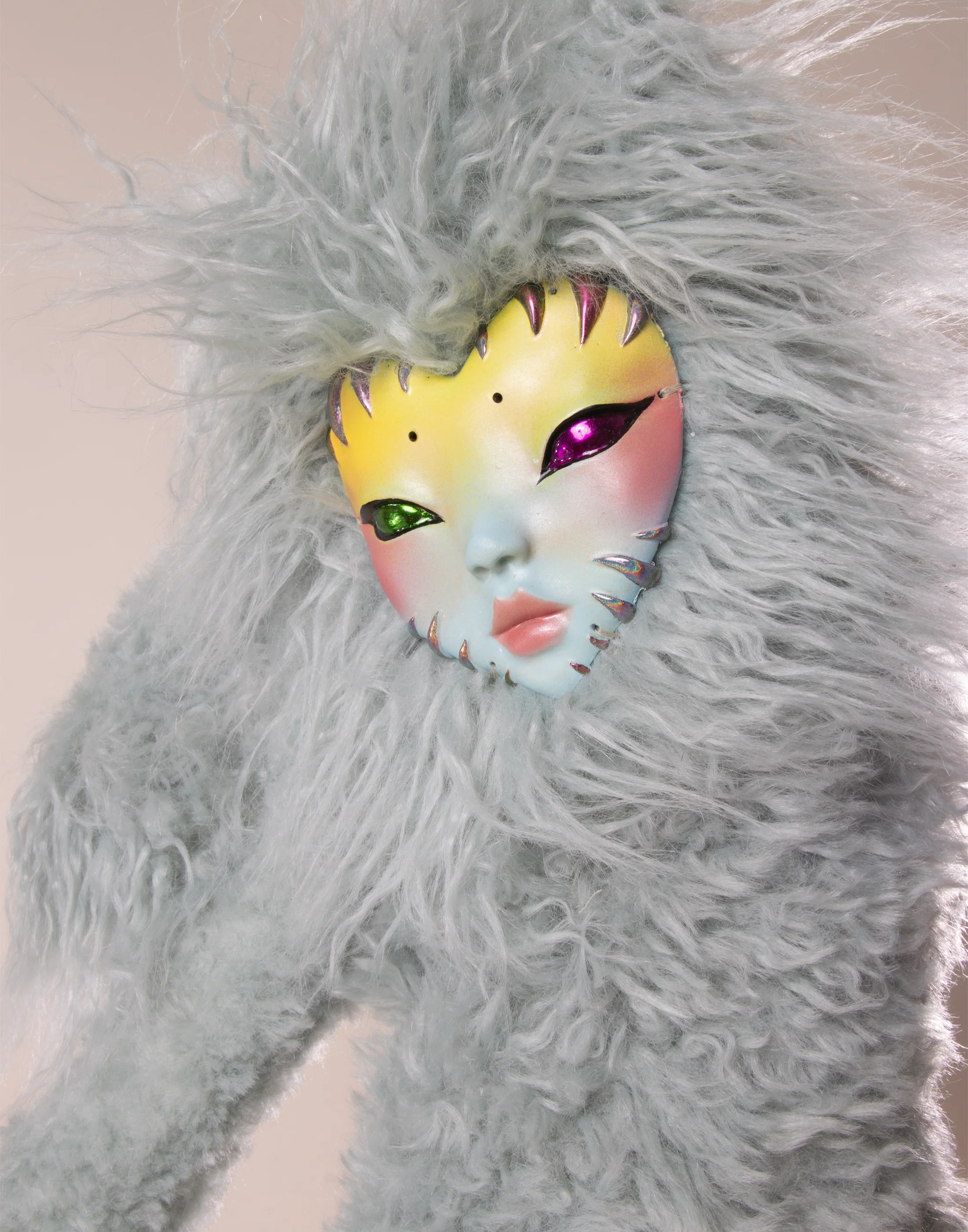 Original face sculpt: hand-cast resin; hand-painted with acrylic paint. Plush body: hand-sewn faux-fur; polyester fiber stuffing with polyester weighted beads at base.
