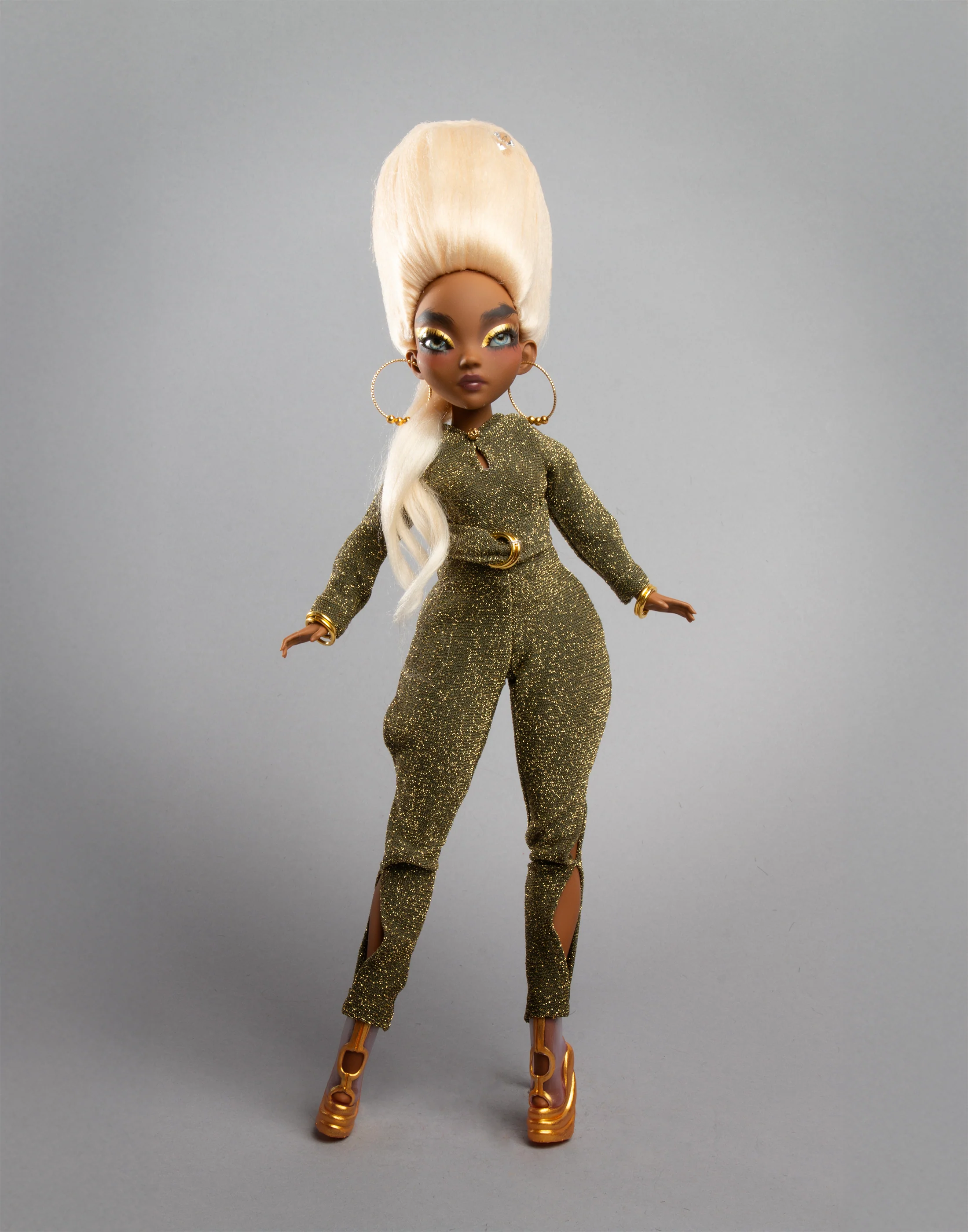 Hand-cast high-quality resin doll with 7 points of articulation internally strung with elastic; hand painted; inset acrylic eyes; removable handmade viscose fiber wig.